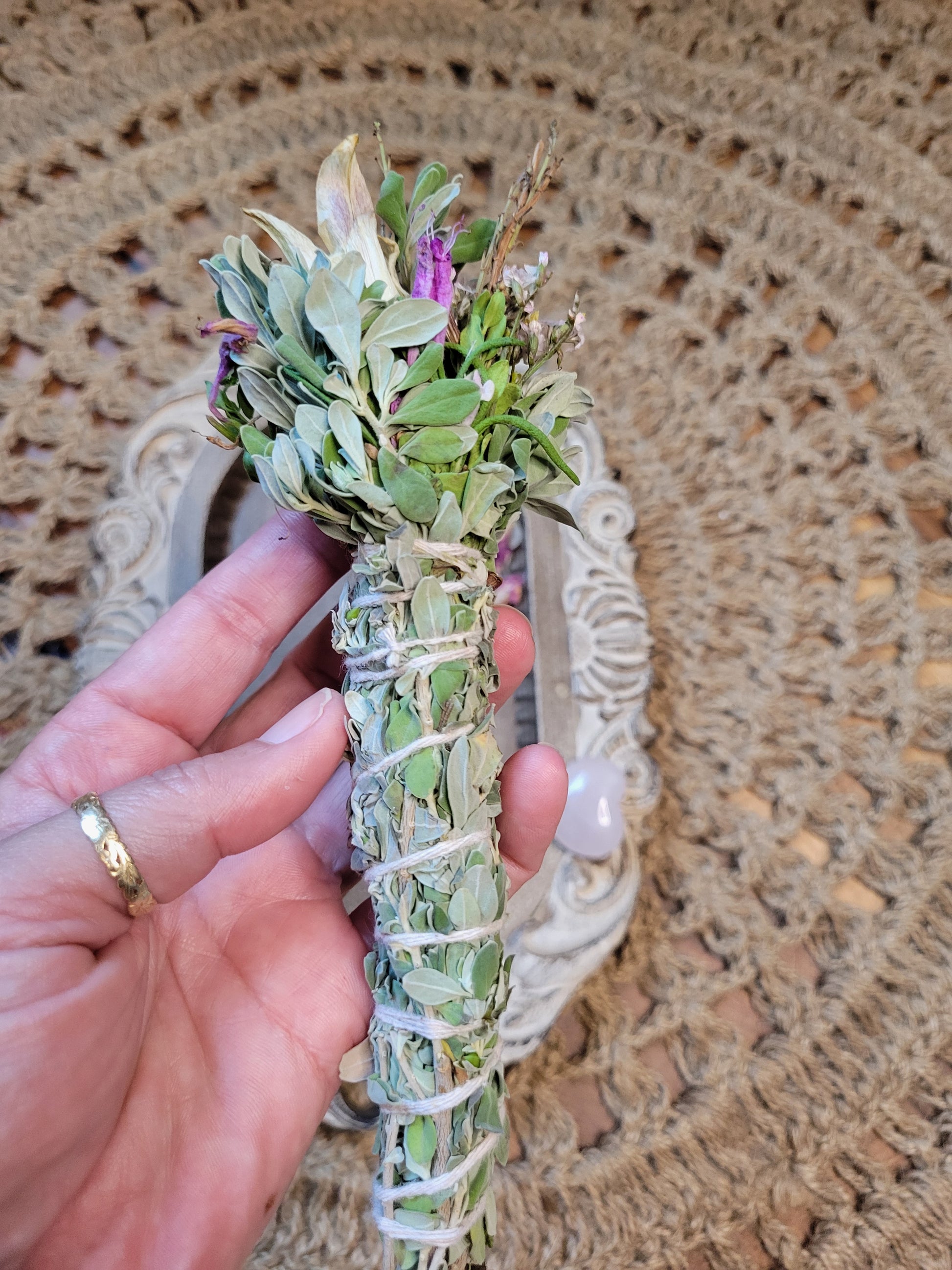 Discover your personal sanctuary with our Tranquil Harmony Blend, a masterfully crafted smudge stick designed for deep peace and emotional balance. We've woven together a delicate bouquet of Baby's Breath, Oriental Lily, Poliomintha (Mexican Sage), Salvia Greggii, and Texas Sage to create a uniquely balanced aroma that soothes the senses and stills the mind.